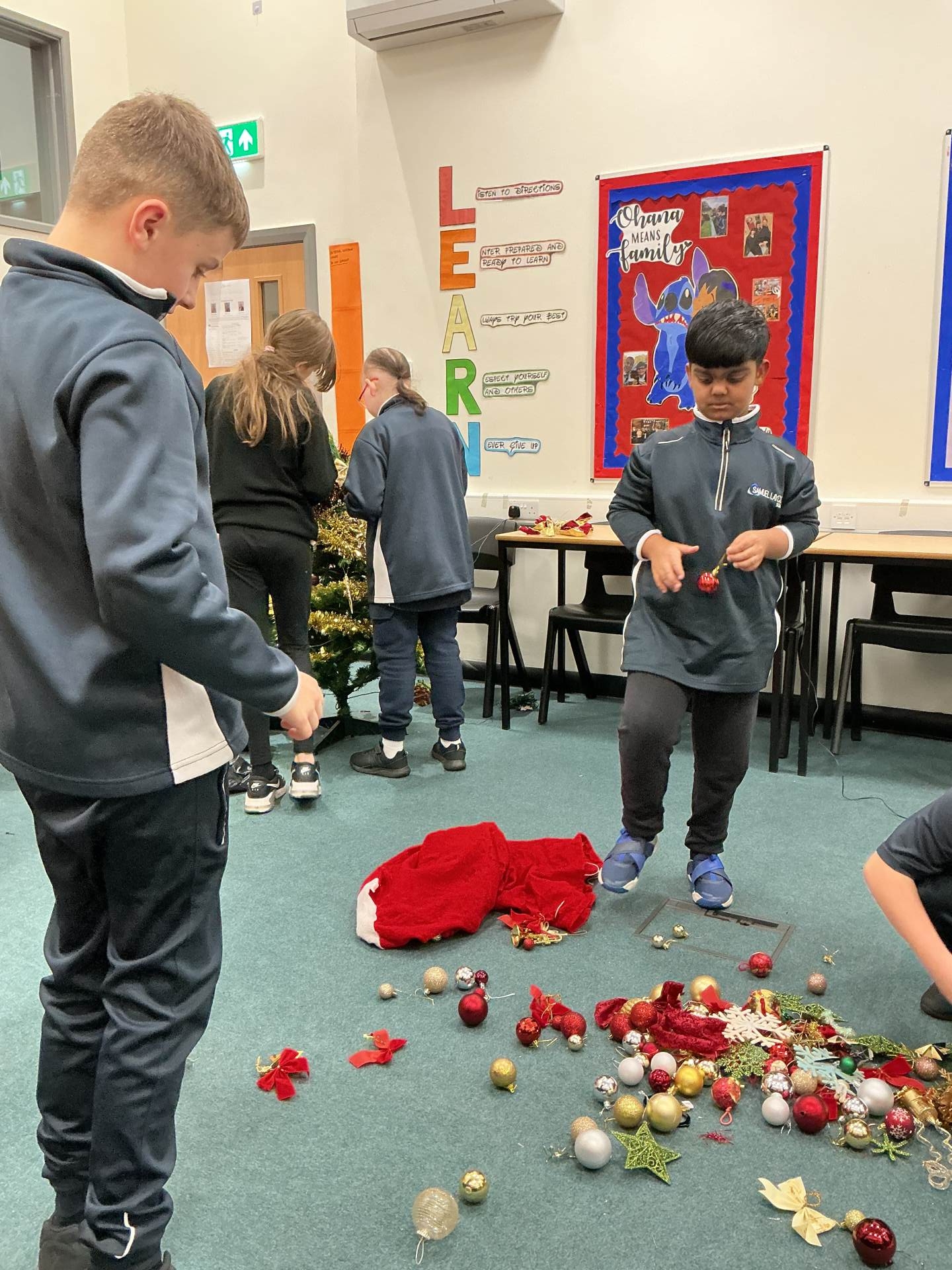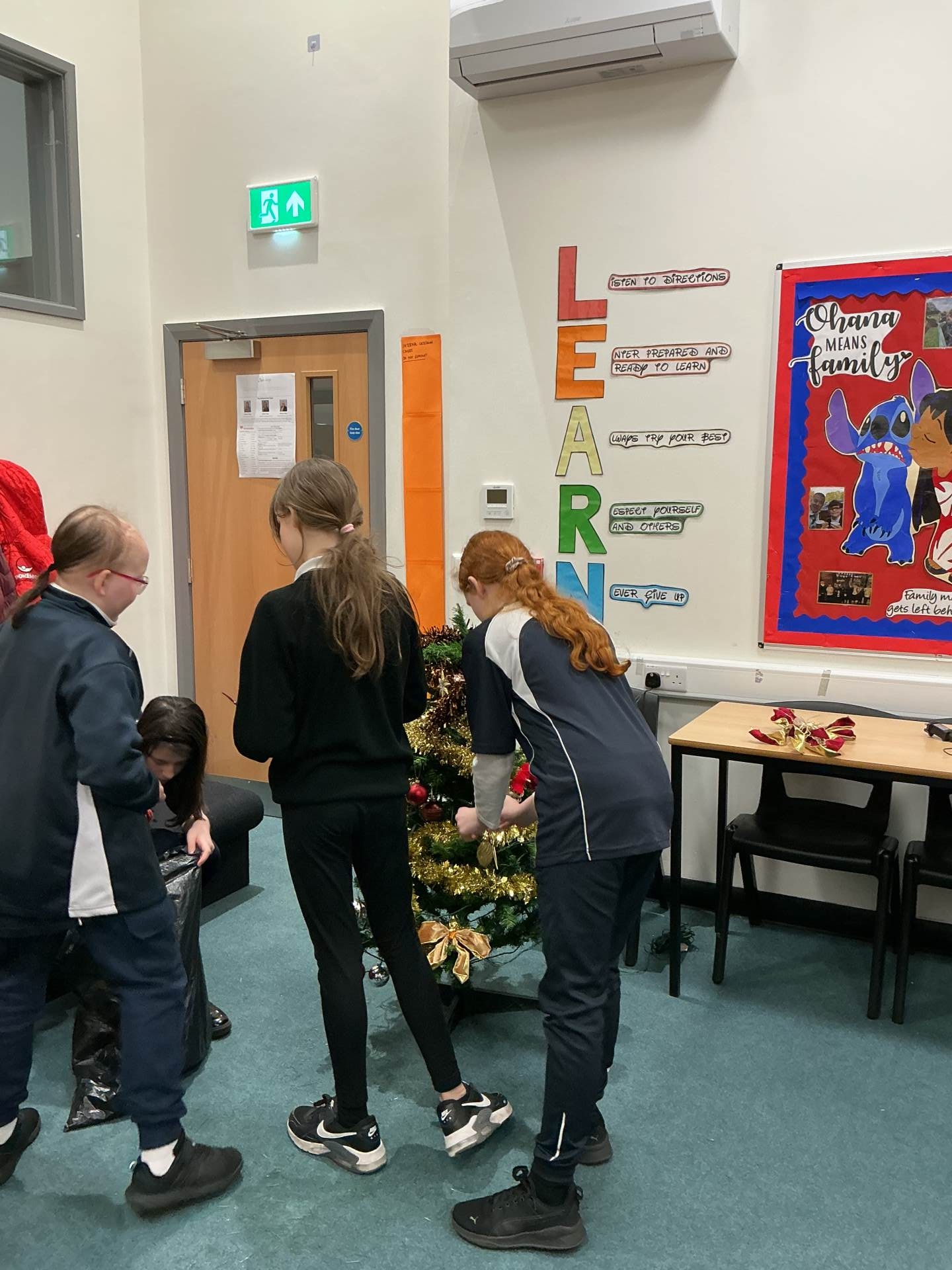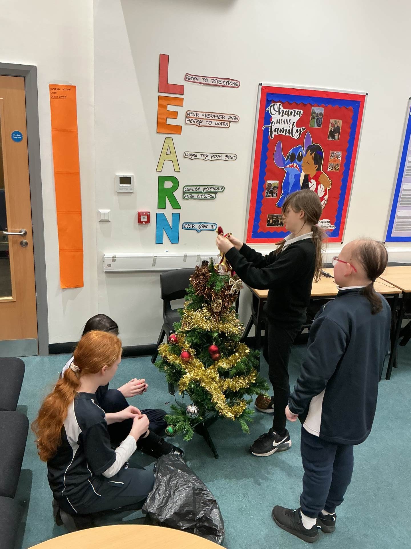 During PSHE, 7F were put into 3 different group and given the materials to put a Christmas tree up. Each group worked together and were able to put the trees up in the classroom. One tree was used for a whole school assembly. All students participated well and were respectful to one another.