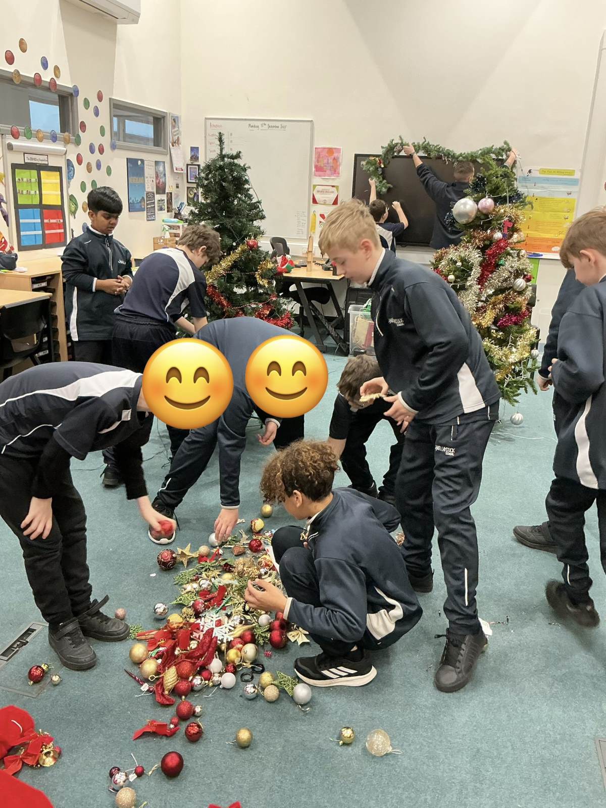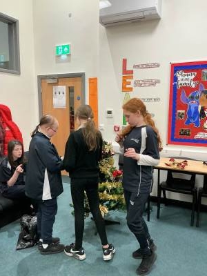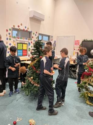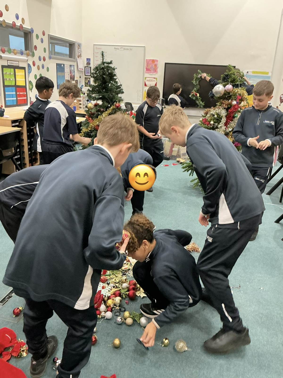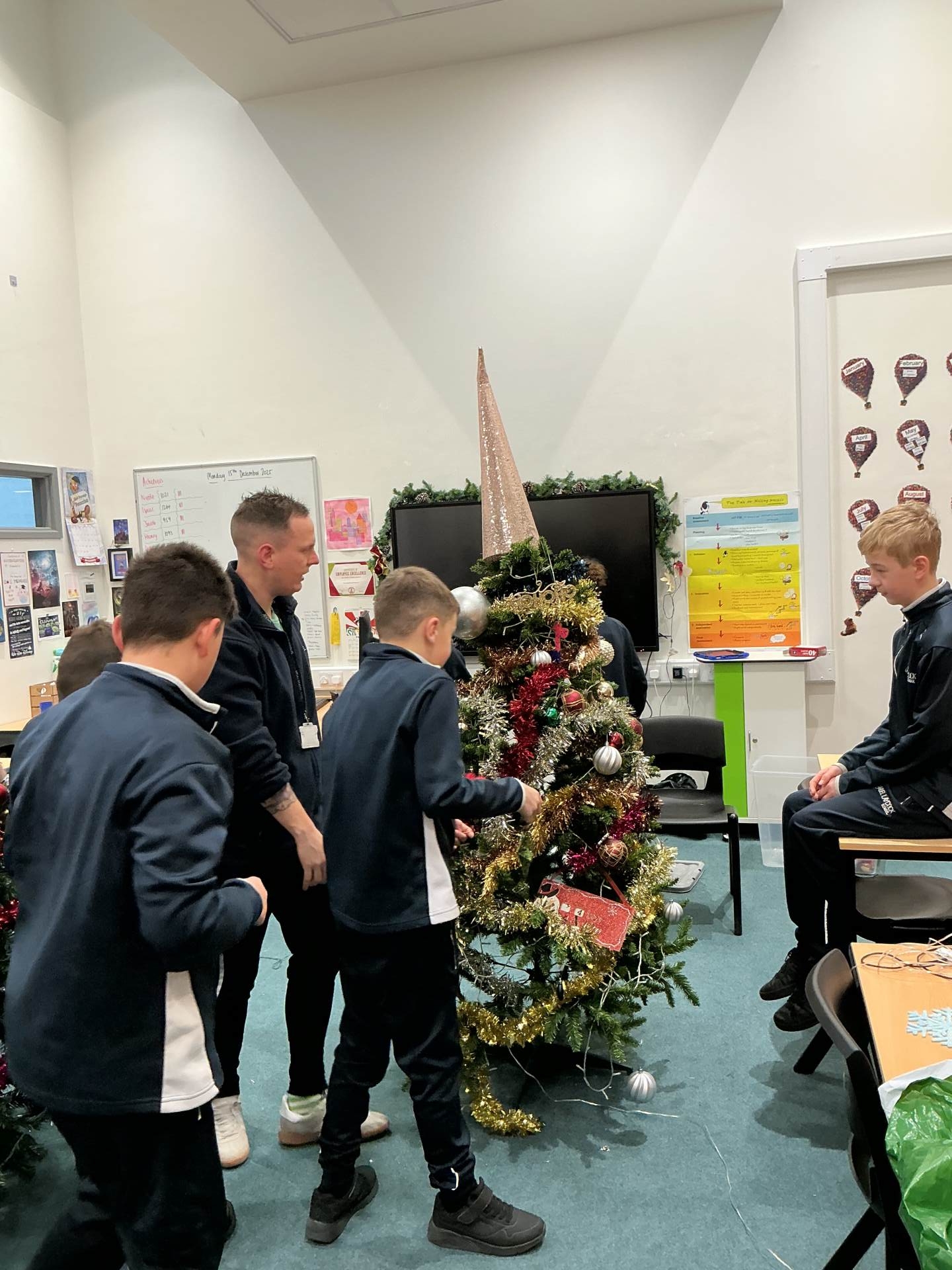 During PSHE, 7F were put into 3 different group and given the materials to put a Christmas tree up. Each group worked together and were able to put the trees up in the classroom. One tree was used for a whole school assembly. All students participated well and were respectful to one another.