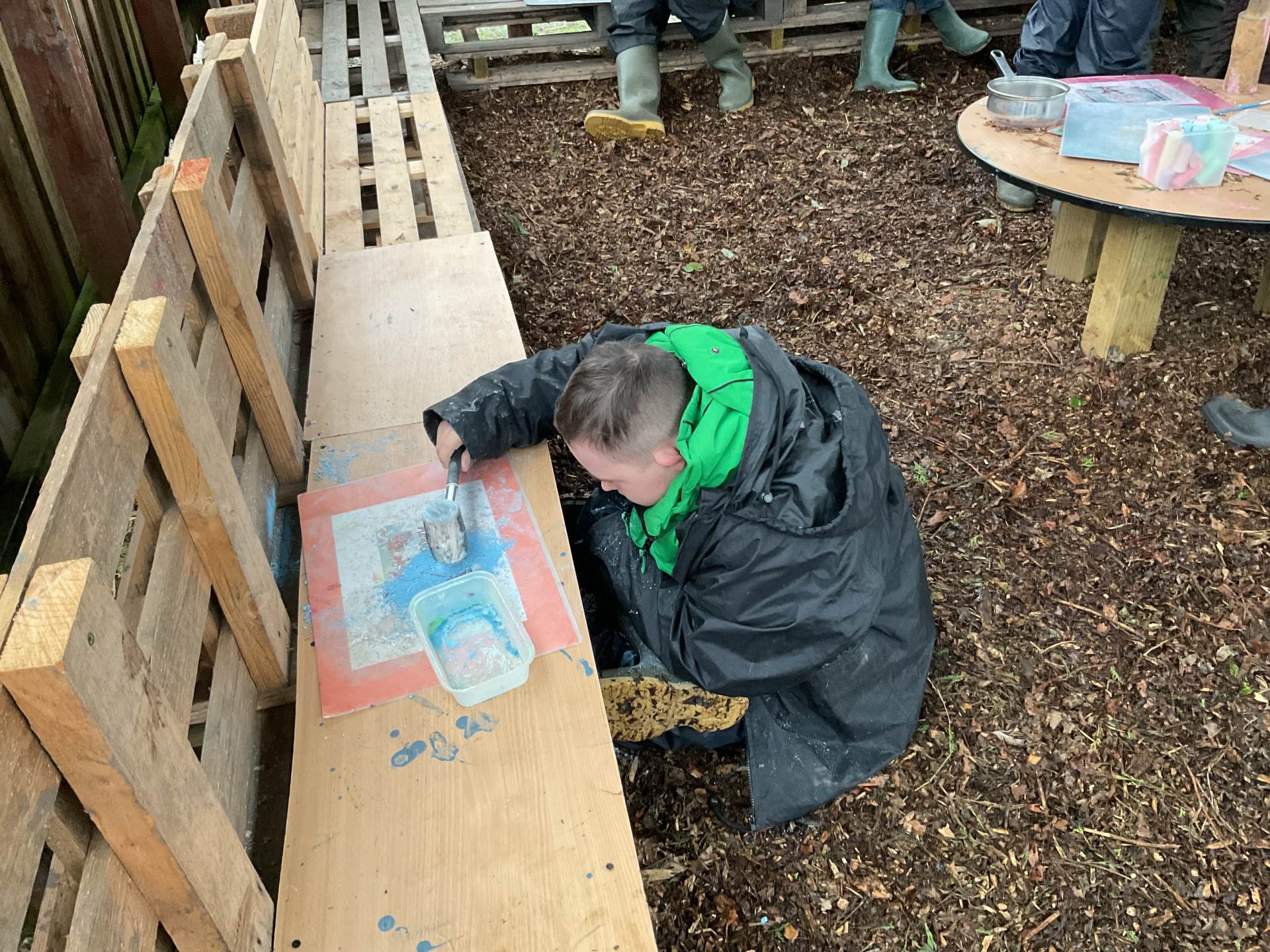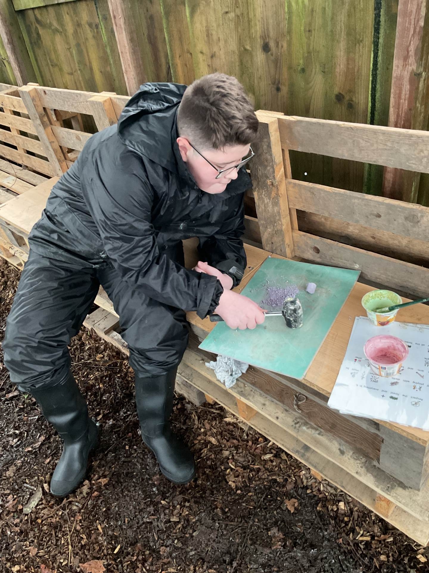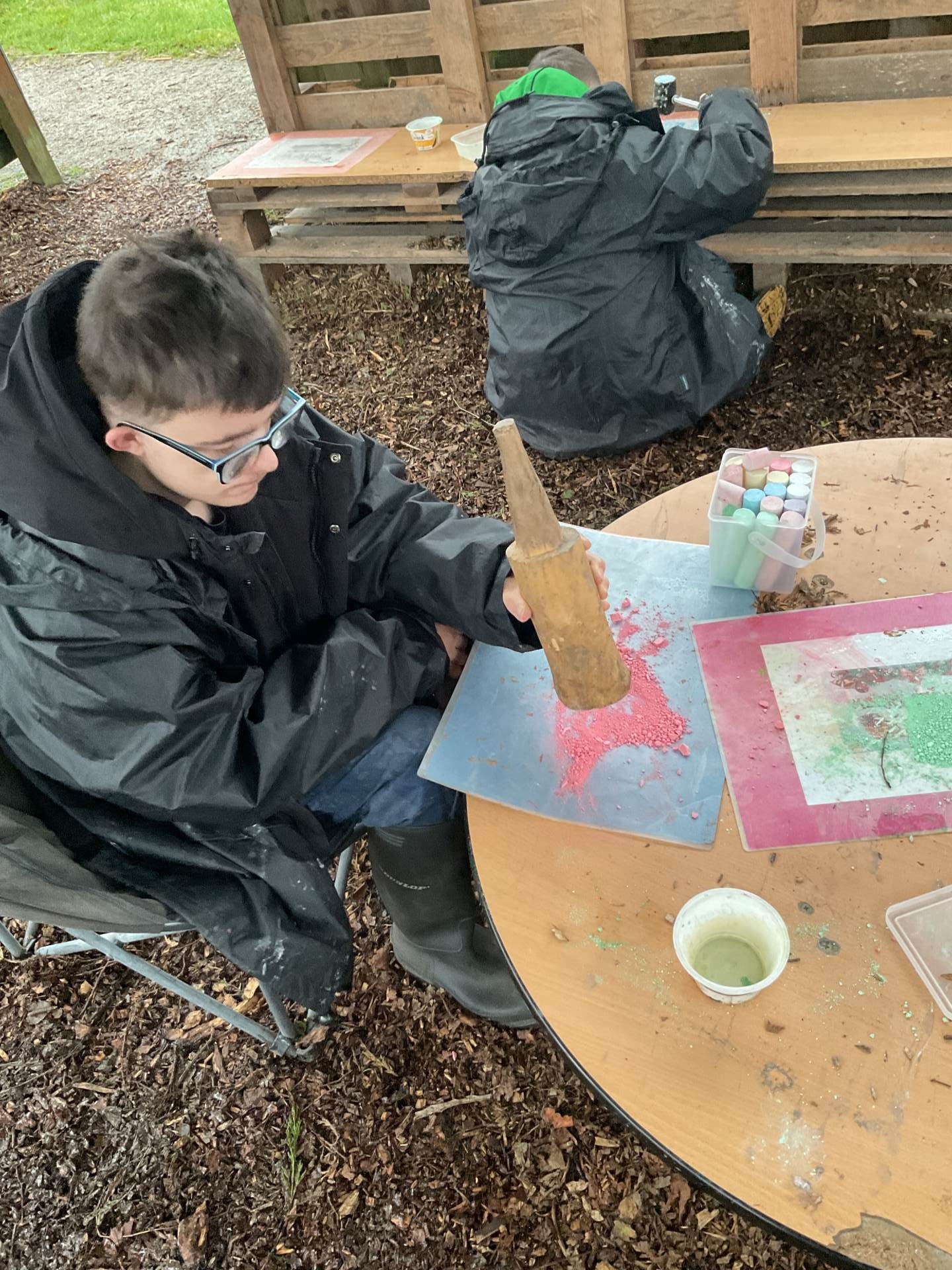 Pupils had to crush the chalk with a mallet until it was a fine power everyone enjoyed this part. Then we all added a small amount of water to make a paste and used it to paint the inside of our forest hut.