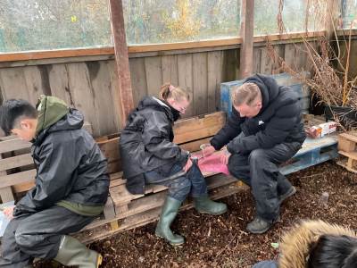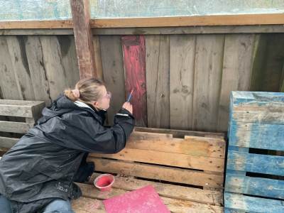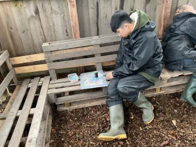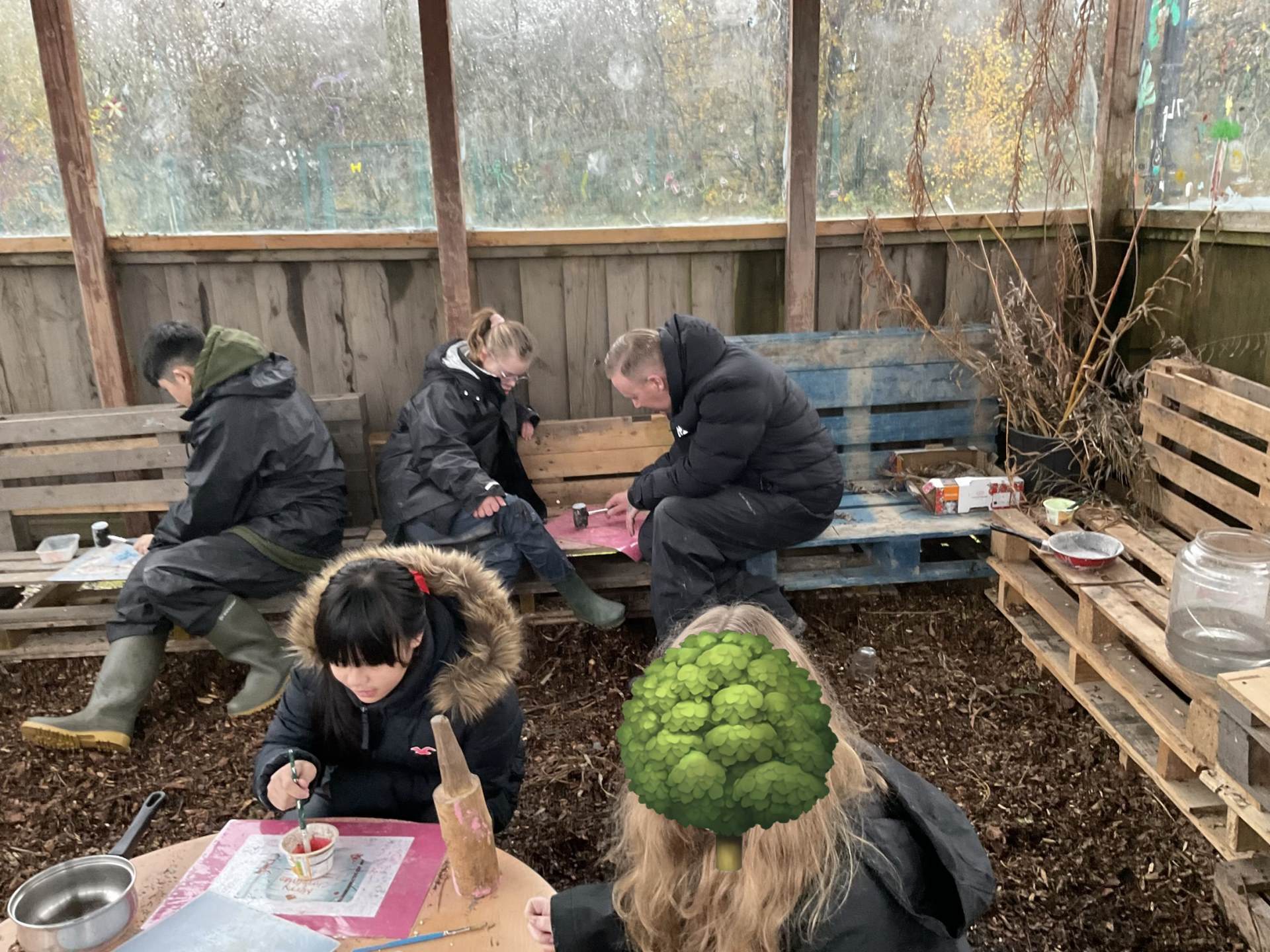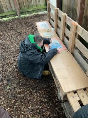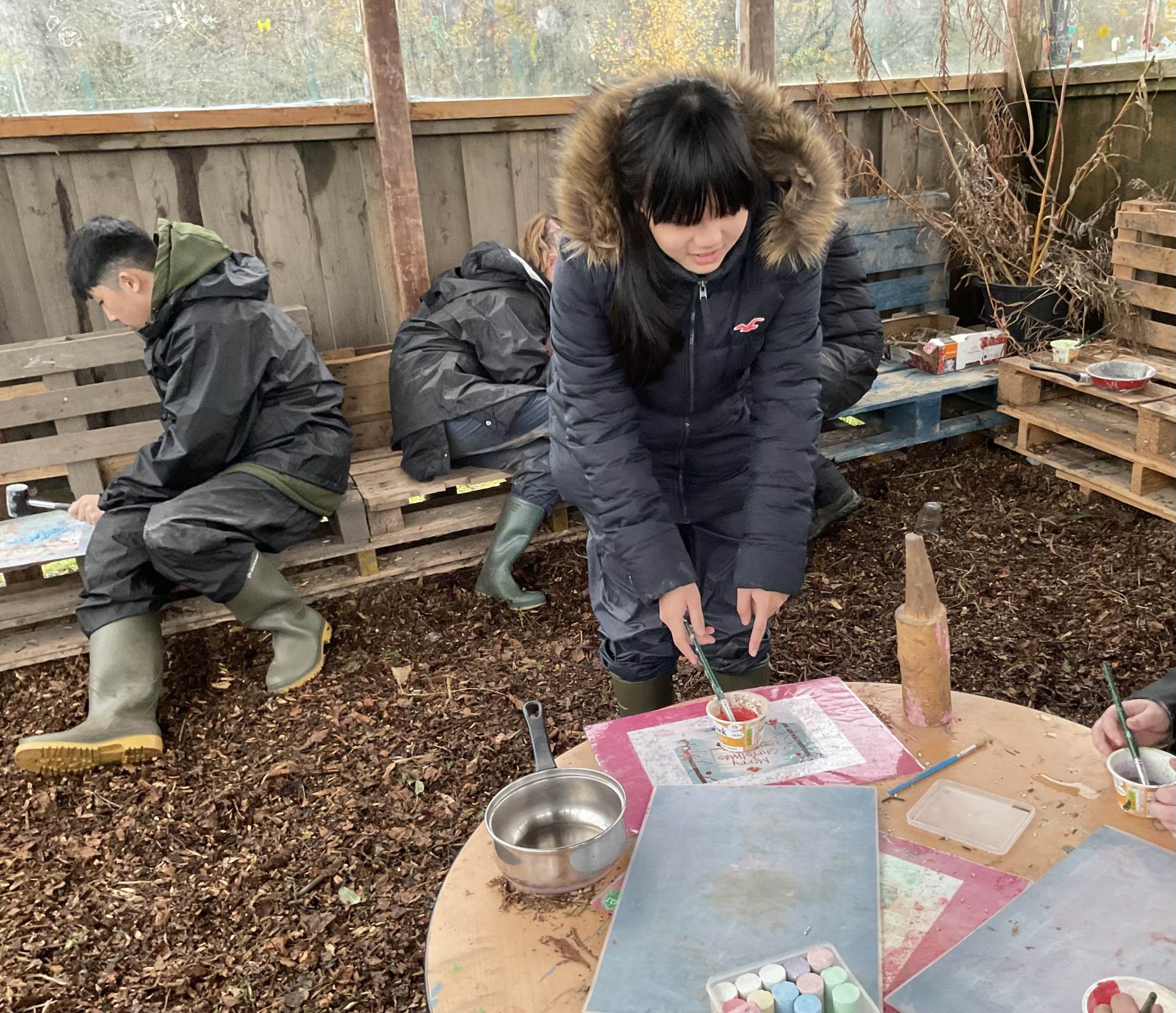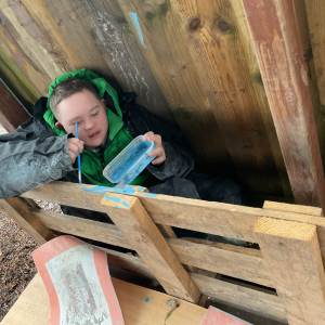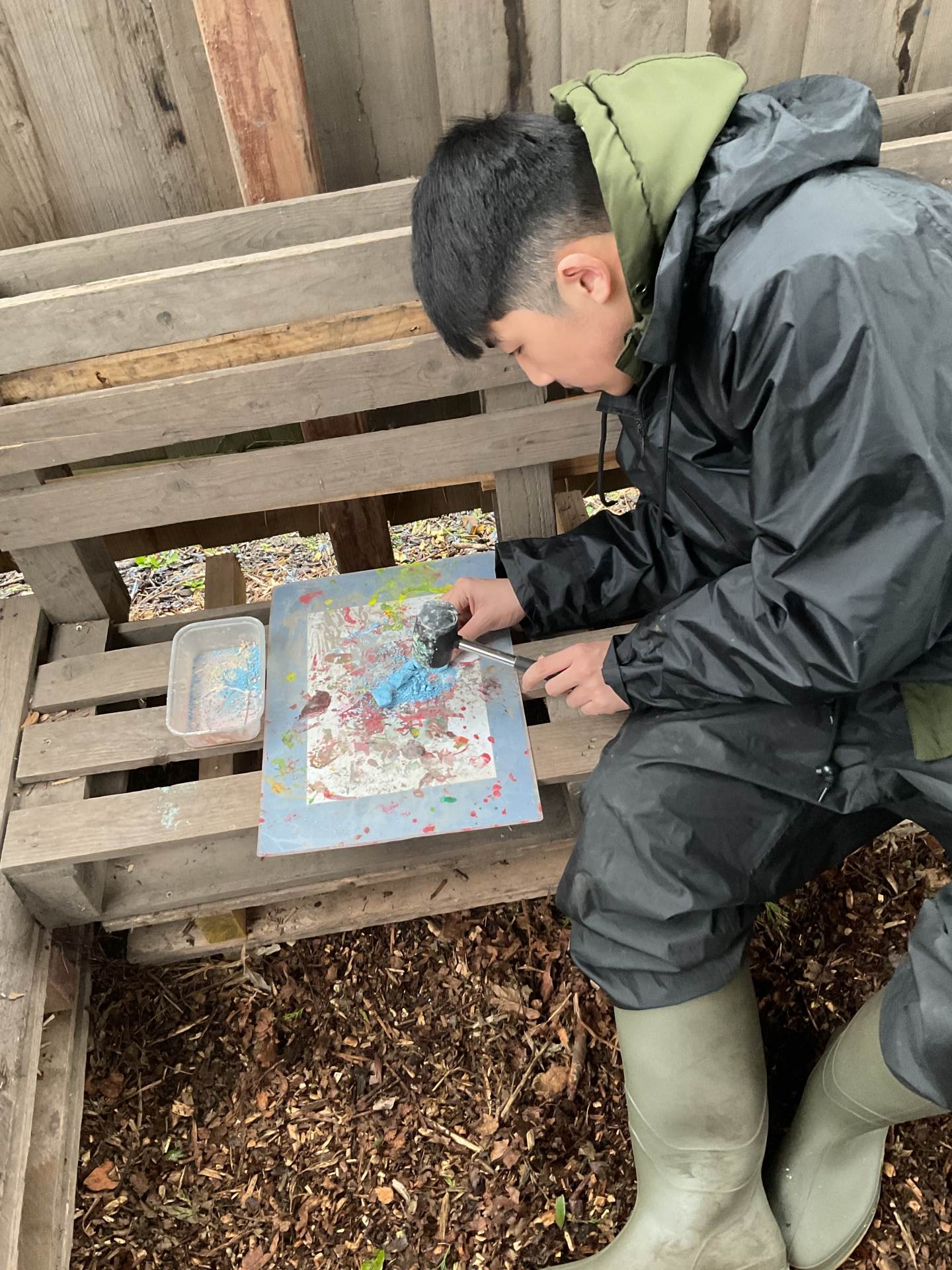 Pupils had to crush the chalk with a mallet until it was a fine power everyone enjoyed this part. Then we all added a small amount of water to make a paste and used it to paint the inside of our forest hut.